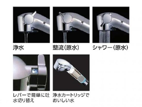 TOTO製 浄水器・整水器 TKGG39E カートリッジ内蔵型浄水器。 濁り・塩素・溶解性鉛はもちろん、一般細菌まで除去できる小型高性能カートリッジを採用。 ミネラル成分はそのまま透過するので、水本来のおいしさを引き出します。 また、ホースとして引き出せるハンドシャワー機能付きで、水を散らすことなくシンクのすみずみまで効率よく洗い流せます。 吐水タイプも3種類あり、吐水口横のレバーで簡単に切り替えられます。