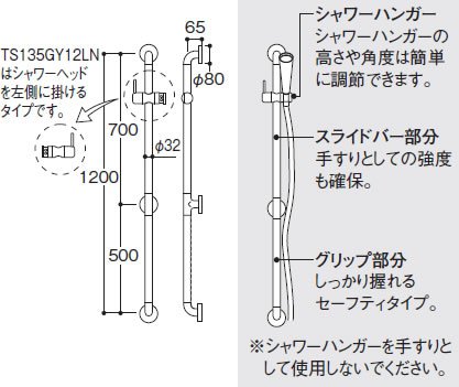 シャワーハンガーの取付位置を調節できるスライドバーと立ち座りをサポートする手すりを1本にまとめた1台2役タイプです。浴室内をスッキリと使いやすくコーディネートできます。 TOTO 浴室用水栓金具【TS135GY12LN#SC1】(ハンガー部:左) シャワー周辺器具 インテリア・バー セーフティタイプ 長さ1200mm