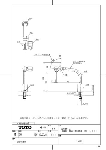 生産期間 2012~ 給水管 - ゾーン キッチン 連結管 - 水栓の種類 単水栓 排水栓 - 取付方法 台付き シャワーヘッド種類 - 水栓の取付穴 一穴 シャワーホース種類 - 水栓の取付形態 - ホース引出し長さ(単位:mm) - 止水ハンドルの形状 穴付レバー 埋め込み深さ(単位:mm) - 止水ハンドルの色 白 電源 - 温度調節ハンドルの位置 - 機能部 - 操作方法(水の出し方) ハンドルを上下操作 機能部形状 - ハンドシャワーの有無 無 給水方法 - 吐水切替の有無 無 排水方法 - 付加機能 熱湯用水栓 使用水 - 使用施設 - 接続ねじ径(単位:mm) 13 一般地/寒冷地 共用 こま種類 - スパウト長さ(単位:mm) 190 TOTOマーク位置 本体正面 湯水心々(単位:mm) - 逆止弁/VB 無 上下吐水 - 備考 - 吐水形態 整流