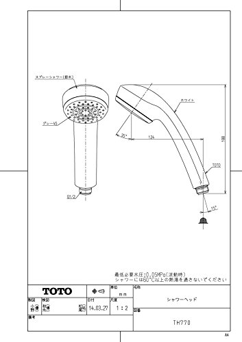 •TOTOの樹脂製節水シャワーヘッド、接続ネジ径G1/2