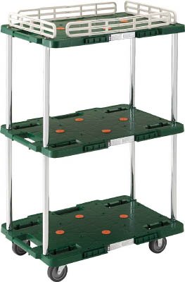 メーカー名:トラスコ中山(株) 【特徴】 荷台は堅牢なリブ構造です。 薬品や溶剤にも侵されにくく耐久性に優れています。 台上に滑り止め用ゴムが4ヵ所ついています。 上部天板に柵が付いていて荷崩れを防止します。(軽量物の積載時) 仕様 高さ(mm):115 均等荷重(kg):100 色:グリーン 長さ(mm):615 幅(mm):415 キャスター径(mm):75 適合ストッパー:- 組立目安:2人30分 全高(mm):943 質量(kg):8.05 組立品 自在キャスター、固定キャスター各2個 上段均等荷重:20kg 中段均等荷重:20kg 下段均等荷重:60kg 3段式タイプ 【材質/仕上】 荷台:再生ポリプロピレン(PP)再生材100% キャスター金具:スチール(三価クロムメッキ) ホイール:ポリプロピレン(PP) 車輪:エラストマー樹脂