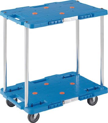 メーカー名:トラスコ中山(株) 【特徴】 荷台は堅牢なリブ構造です。 薬品や溶剤にも侵されにくく耐久性に優れています。 台上に滑り止め用ゴムが4ヵ所ついています。 仕様 高さ(mm):115 均等荷重(kg):100 色:ブルー 長さ(mm):615 幅(mm):415 キャスター径(mm):75 適合ストッパー:- 組立目安:2人30分 全高(mm):633 質量(kg):5.4 組立品 自在キャスター、固定キャスター各2個 上段均等荷重:30kg 下段均等荷重:70kg 2段式タイプ 【材質/仕上】 荷台:再生ポリプロピレン(PP)再生材100% キャスター金具:スチール(三価クロムメッキ) ホイール:ポリプロピレン(PP) 車輪:エラストマー樹脂