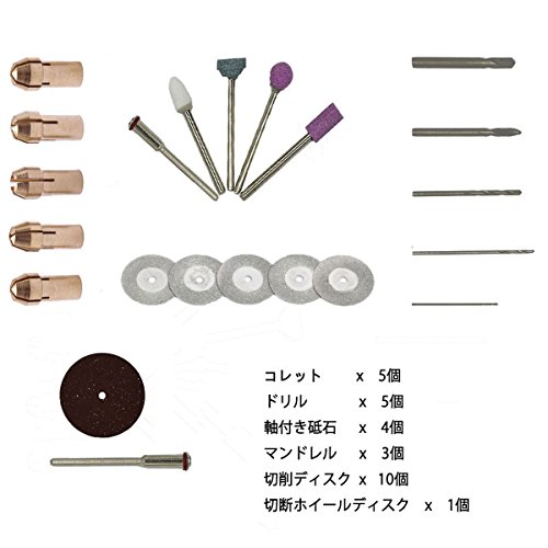 - 豊かな内容:金属用(WA)軸付砥石X4本、ダイヤモンドビットX1本、マンドレルX3本、HSSドリルX5本、コレットX5個 切削デイスクX10個など