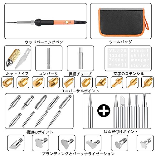 - 【42 IN 1 多機能】1個 X ペン、31個 X 交換可能なチップ、1個 X ホットナイフ、2個 X 文字のステンシル、2個 X コンバータ、1個 X スポンジクリーニング、1個 X メタルスタンド、 1個 X バッグ。