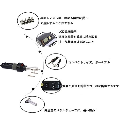 - 用途:必要に応じて異なるタイプのノズルも自由に選択することができます。プラスチック溶接、熱処理、熱収縮チューブ、回路基板が必要なあらゆる作業に