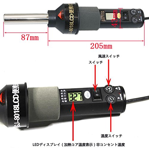 - 温度調節可能:温度、風量調整範囲の精密な制御が可能です。デジタル表示付き、温度、風量調節可能です