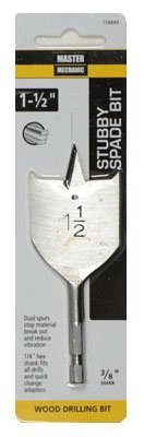 Eliminates wood splintering. With cutting spurs. Stubby blade bit. Master Mechanic. Master Mechanic, 1/2" x 4", Stubby Spade Bit, With Cutting Spurs For Cutting Smooth & Fast While Eliminating Wood Splintering, 4" Length For Hard To Reach Places, Carded.