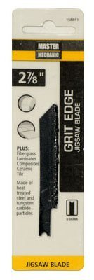 Size 2-7/8 inches. Carbide grit jig saw blade. Made of heat treated steel. Allows for cutting into tough materials such as ceramic tile, plaster, pipe, conduit and marble.. Master Mechanic, 2-7/8", Carbide Grit Jig Saw Blade, Allows For Cutting Into Tough Materials Such As Ceramic Tile, Plaster, Pipe, Conduit & Marble.