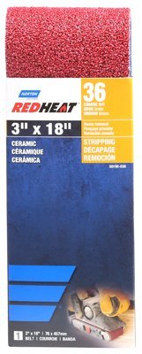 Norton Red Heat Sanding Belt is specially designed for use on wood, metal, fiberglass or painted surfaces. Formulated with a sharp ceramic grain belt cuts faster, sands cooler and lasts up to four times longer than traditional sanding belts. Available in a 36 grit and measures 3" x 18".