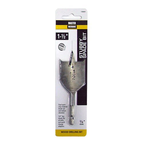 Size: 1-1/2" x 4". Stubby spade bit. Has cutting spurs for cutting smooth and fast while eliminating wood splintering. 4" length for hard to reach places. Master Mechanic, 1-1/2" x 4", Stubby Spade Bit, Has Cutting Spurs For Cutting Smooth & Fast While Eliminating Wood Splintering, 4" Length For Hard To Reach Places, Carded.