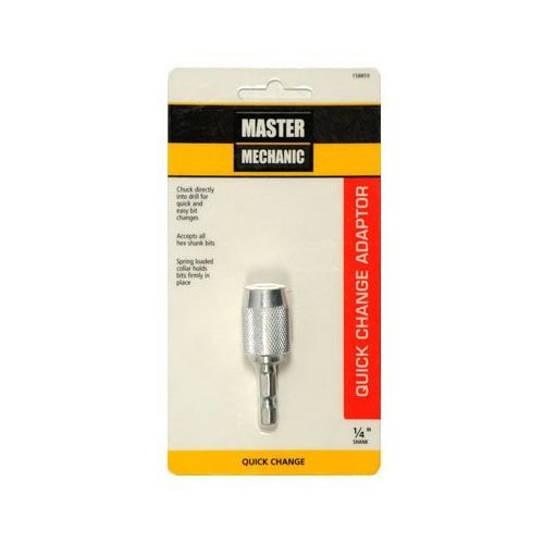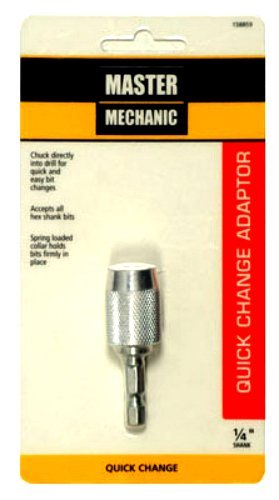 Durable construction. Pull back sleeve to operate. Quick draw connector. Master Mechanic. Master Mechanic, Quick Draw Connector, Allows You To Chuck Directly Into Drill For Quick Accessory Changes Works With All 3/8" & 1/2" Drive Drills, To Operate Pull Back Sleeve & Insert 1/4" Quick Shank Accessory, Then Release The Sleeve To Lock Tool In Place. Change Tools In Seconds Without Re-Chucking Your Drill.