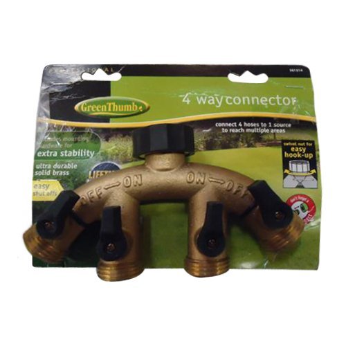 A great four way manifold, that will be sure to cover all of you watering needs. Green Thumb, four way, brass faucet to hose manifold. Allows four connections to only one faucet. Comes with over molded shut off levers, and swivel. This makes handles are easy to grip, and turn. Manifold is constructed from durable, and sustainable brass.
