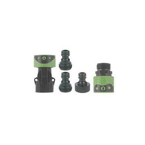 Green thumb 2939qcgt poly quick connector complete connector set contains 1 female hose end with shut off, 2 male hose end adapters, 1 female faucet adapter and 1 male faucet adapter.
