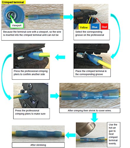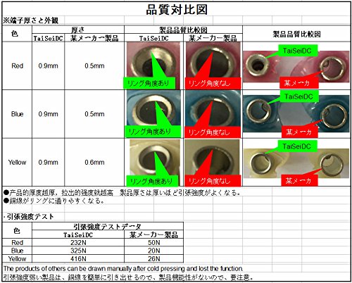 商品説明: 防水形圧着スリーブ 二層構造 半田付き、接着剤付き 収縮比3 : 1 防水性、耐久性、引き抜き強度を改善加強。 耐磨耗性・耐腐食性・防湿性・防水性に優れ、高透明・高弾力性を持つ、 高品質低コストで提供いたします。 電工系、家電系、船、車、バイクの電装系 仕様 サイズ:黄6.5mm、青5.5mm、赤4.5mm 耐熱範囲:-55 ℃-125 ℃ 最低収縮温度:80 ℃ 完全収縮温度:130℃ 。 (※対応ワイヤーサイズ赤 :0.5-1.5mm² 18−22 AWG 厚さ 0.9mm 長さ:38mm 青:1.5-2.5mm² 16−14 AWG 厚さ0.9mm 長さ:38mm 黄:4.0-6.0mm² 12−10 AWG 厚さ0.9mm 長さ:42mm) RoHS規格。
