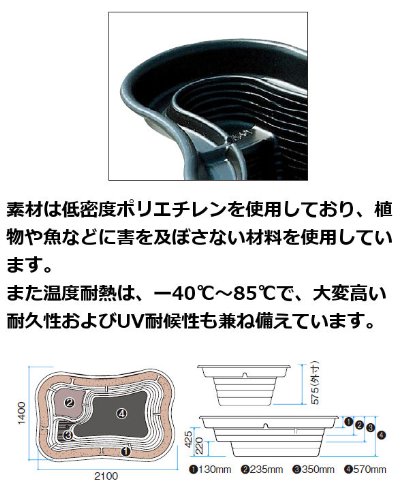 「成 型 池」は、、特にガーデン用に設計された池です。自然に近い池を簡単に造ることができきます。魚を熱や凍結から守るのに適度な深さがあり、棚に睡蓮などの水生植物を植えるのにも適しています。また池の形がすでに決まっているので、最終的にどのような形になるのかが分かり周りに配置する植物や石なども考えやすく、また施工性にも大変優れています。