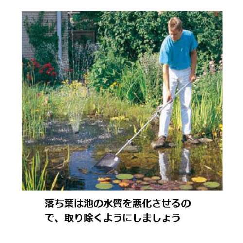 「池用ごみ取アミ」で、池の水質を悪化させる落ち葉やごみを、取り除くようにしましょう。