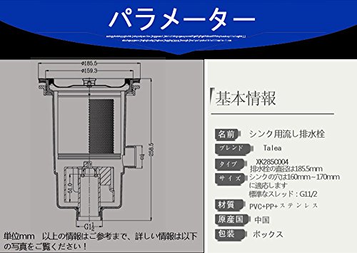 排水栓の直径は185.5mm、ホース接続部のネジサイズG1 1/2(呼び40)、取り付けネジ直径159.3mm