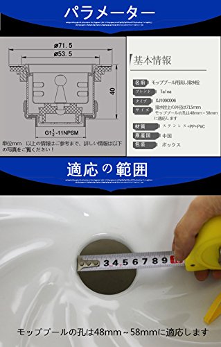 排水栓上の外径は71.5mm モッププールの孔は48mm~58mmに適応します