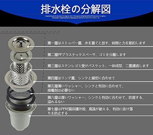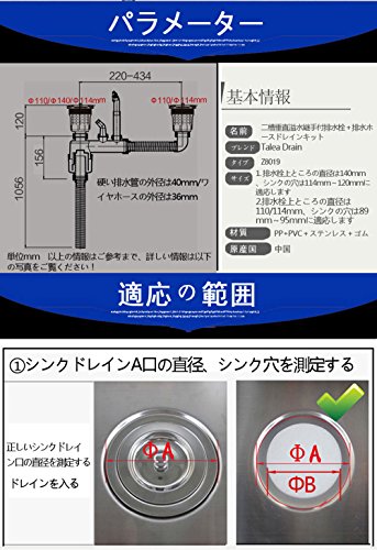1.排水栓上ところの直径は140mm、シンクの穴は114mm~120mmに適応します 2. 排水栓上ところの直径は110/114mm、シンクの穴は89mm~95mmに適応します