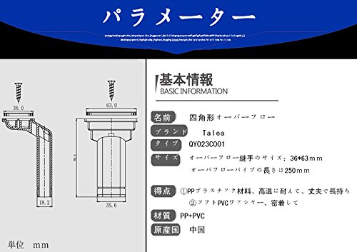 オーバーフロー:長さ63*幅36mm、オーバーフローパイプの長さは250mm 1.四角形オーバーフロー硬質パイプ付き、市場では珍しい 2.工事プラスチック、丈夫で長持ち