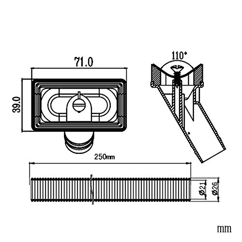 - オーバーフロー用ホースの内径は21mm、外径は26mm、長さは250mm