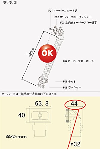 - オーバーフロー用ホースの内径は32mm、外径は36mm、長さは460mm