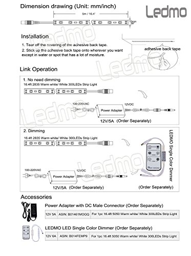 - Need to feed by a 12V/5A (60Watt) Power Adapter( ASIN: B01461MOGQ ). Dimmable with LED Single Color Dimmer(ASIN: B014EZ4M0K)