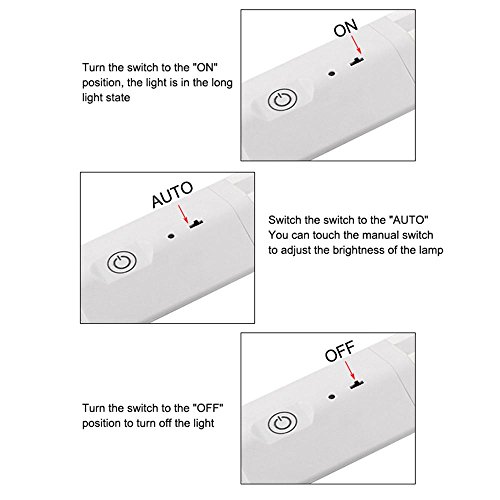 - 3モードがあります。スイッチがオンに:をオンの位置にすると、ライトは最後の照明を当てるなどの方法があります消灯オフの位置のスイッチをONにすると、ライトがオフであることを示しています。自動:オンをスイッチをAUTOの位置、ボタンを長いタッチするランプの明るさを調整します。