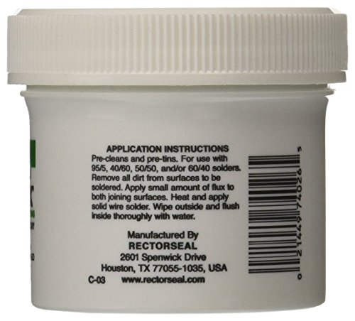 Jar. Sold as 6 UNITS at $4.22 per unit. (1 unit = each.) Lead free flux containing powdered solder for added insurance against a leak free joint. For use with 95/5, 50/50, 40/60 and 60/40 solders. Pre-cleans and pre-tins. Contains 95/5 tin antimony. Jar. 3 Oz. . Manufacturer number: 74026. SKU #: 2135051. Country of origin: (TBA). Distributed by Rectorseal Corporation.