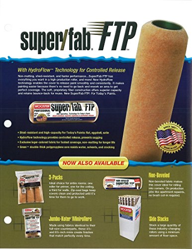 Shed-resistant and high capacity For Today's Paints; flat, eggshell, satin. Hydro Flow technology provides controlled release, presents sagging. Exclusive lager-colored fabric for fastest coverage, non-matting for longer life. Green double -thick polypropylene core resists water, solvents and cracking. Super Fab, 4" x 1/2", Shed Resistant Roller Cover, High Capacity, Flat, Eggshell, Satin, Hydro Flow Technology Provides Controlled Release, Prevents Sagging, Exclusive Lager Colored Fabric For Fastest Coverage, Non-Matting For Longer Life, Green Double Thick Polypropylene Core Resists Water, Solvents & Cracking.