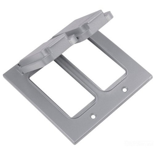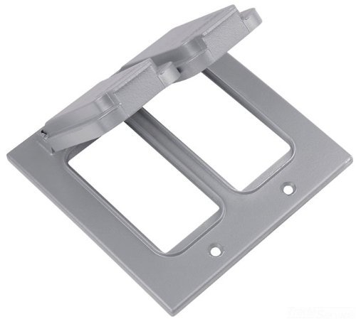 Device Box Cover; Double Lid; 2 Gang; 4-5/8-Inch Width; 4-9/16-Inch Height; Die Cast Aluminum Material; Aluminum Lacquer Finish; Silver Color; Horizontal Position; For Two GFCI Device; UL Approval; 1 Standard Package.