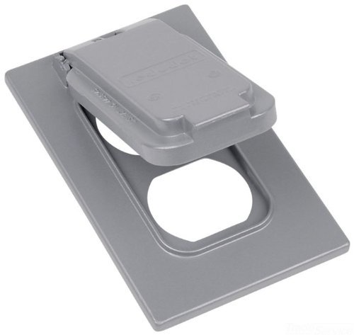 Device Box Cover; Single Lid; 1 Gang; 2-13/16-Inch Width; 4-9/16-Inch Height; Die Cast Aluminum Material; Aluminum Lacquer Finish; Silver Color; Vertical Position; Device Mount; For Duplex Receptacle; UL Approval; 1 Standard Package.
