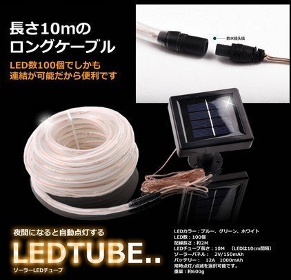夜になると自動点灯 LED100個搭載で 長さ8m ソーラーLEDチューブ グリーン