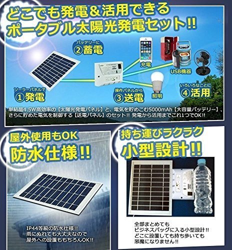 - 高効率の太陽光発電パネルと、5000mAh大容量バッテリー さらに電気を制御する送電パネルのセット!! 発電から蓄電・活用までこれ1つでOK!!