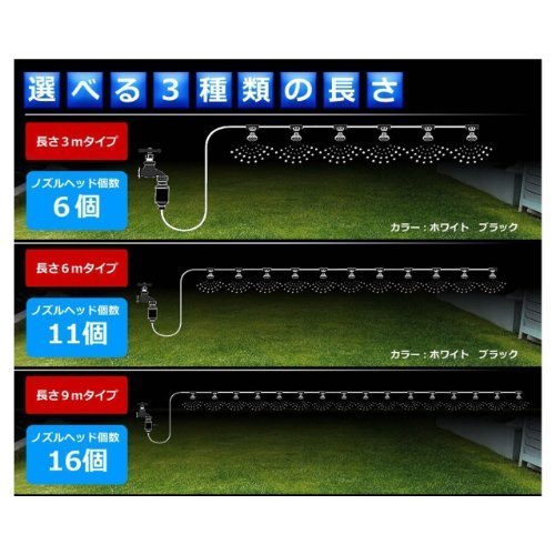 - ノズルヘッド個数:3mでノズル6個搭載 6mでノズル11個搭載 9mでノズル16個搭載
