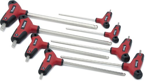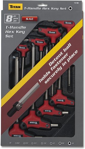 Titan's 8-piece SAE ball detent T-handle hex key sets include the following sizes - 1/8, 9/64, 5/32, 3/16, 7/32, 1/4, 5/16, and 3/8 in. , with a handy plastic storage tray. Each key is clearly marked for easy identification and selection and features a detent ball to securely hold the fastener in place. Titan designed SAE T-handle hex keys with high-impact molded plastic handles to reduce hand fatigue and provide increased turning power and control.