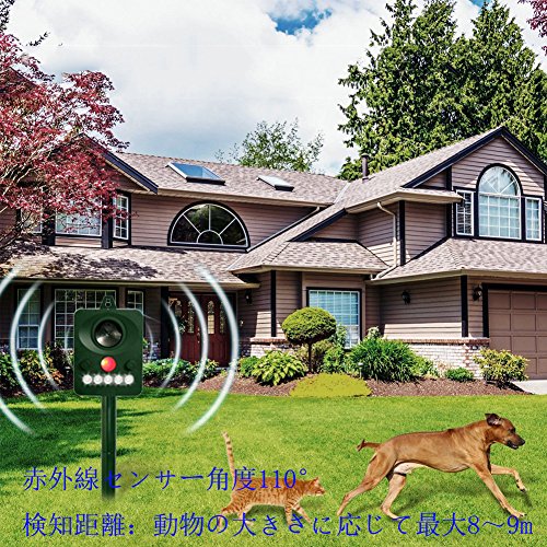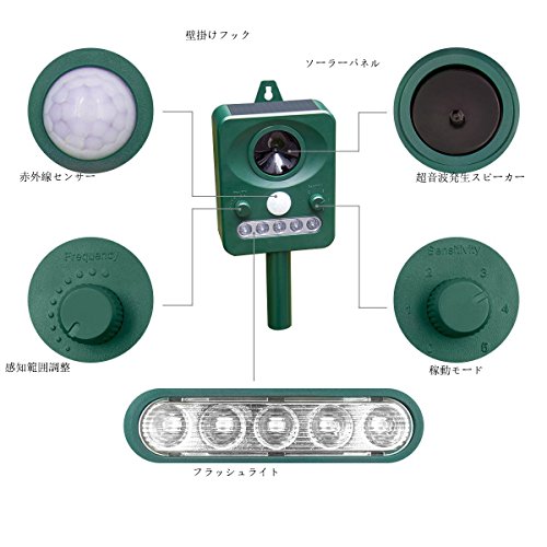 - 動物嫌がる周波数帯の超音波やLEDによるフラッシュ光を自動的に放射して猫やネズミ、鳥などを寄せ付けないようにします。動物にとって一切の危険がありません。人体と環境も無害です。