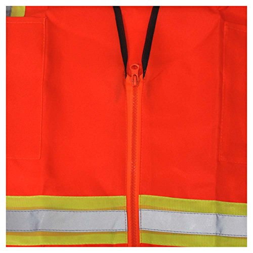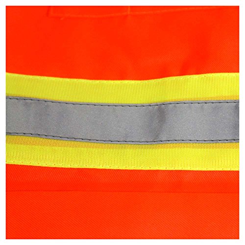 2 Large front bottom pockets, and 2 upper multi-pockets provide for pens or small tools;100% Polyester fabric in ultra bright highly visible neon orange color size medium (64 x 58cm);Reflective stripes all around the mid section and over both shoulders & down the back;Stripes are a 2 inch combination of neon green fabric and silver reflector stripe;Oversized arm openings allowing room to be worn over regular clothing