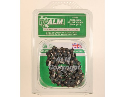 The ALMCH045 Chainsaw Chain has a 3/8 inch.low profile (L/P), 0.043 in.guidebar slot 0.375 mm.This chain is made to fit the Black and Decker range and suit saws with a 30 cm.bar and chain with 45 drive links including: GK1730TK.