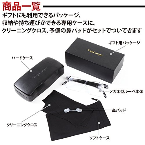 - 素材にこだわったセット内容。めがねタイプのルーペは、両親、夫、妻、兄弟、お友達へのプレゼント、ギフトとして利用されている商品です。ルーペ本体、ギフト用パッケージをはじめ、ハードケース、ソフトケース、クリーニングクロス、予備の鼻パッド、取扱説明書と、素材にこだわり、長く使えるようなセットになっています。