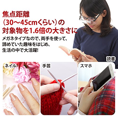 - 眼鏡型拡大鏡(ルーペ)の本製品は、焦点距離(30~45cmくらい)の対象物を1.6倍の大きさに拡大するので、両手を使って、諦めていた趣味(読書、スマホ、手芸、模型作り、釣りの準備、タブレット、ネイルなど)をはじめ、生活の中で大活躍。hazukiルーペが有名ですが、ルーペ自体は同じような仕組みです。