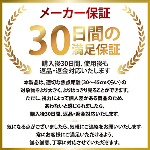 - 安心の30日間の満足保証(メーカー保証)。見え方(視力による個人差)、初期不良ももちろん、通常使用での破損も対象。ルーペなので、目からの距離を調整することで対象物を拡大できますが、メガネタイプのため、視力によって、あわない場合がございます。満足いただけない場合は、購入後30日間の返品・返金対応。メガネ型ルーペは石坂浩二さんCMのハズキルーペが有名ですが、満足保証をつけ、満足をお届け