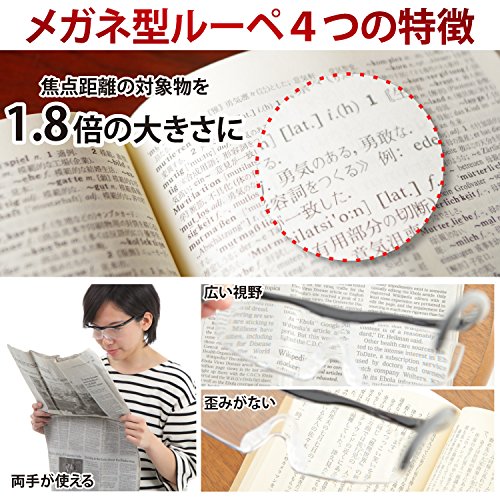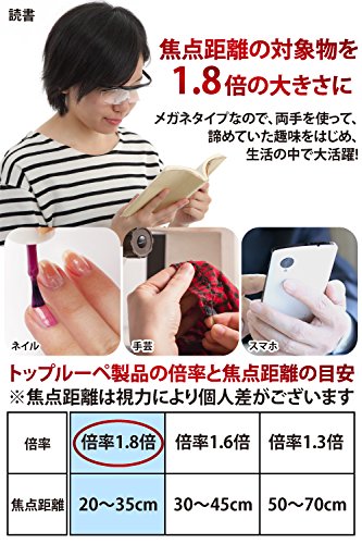 - 拡大鏡 めがね ( ルーペ )の本製品は、焦点距離(20~35cmくらい)の対象物を1.8倍の大きさに拡大するので、両手を使って、諦めていた趣味(読書、スマホ、手芸、模型作り、釣りの準備、タブレット、ネイルなど)をはじめ、生活の中で大活躍。ハズキルーペ以外の拡大鏡 めがねの商品と比較し、本体自体はほぼ同じ性能。他社商品と比べ、パッケージとハードケースはしっかりしたものを使用し、耳かけなど安価な付属品は省いております