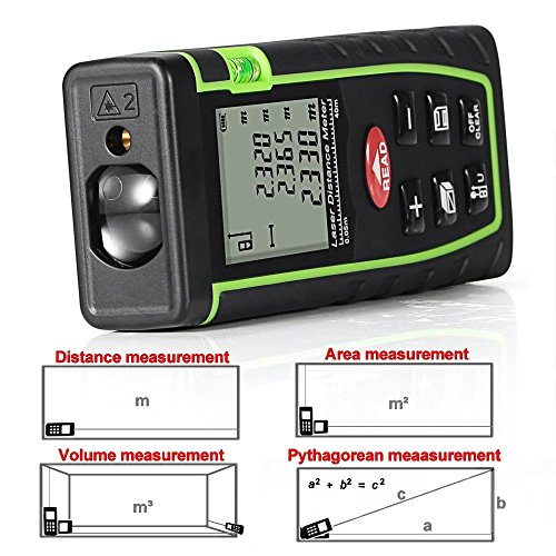- 【多種測定】距離/面積/体積・容積/ピタゴラス(辺測定)/連続測定という作業に応じて選べる5種類の測定モードがあり、測定値の加算、減算機能もついて、非常に便利です。測定基準:本体前端/本体後端。離れた場所から対象物に可視レーザーの光を当てて、ボタンを押すだけで、簡単・正確に距離、面積、容積などを測定します。