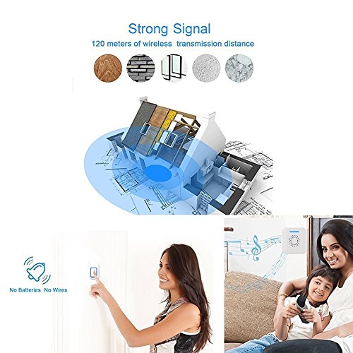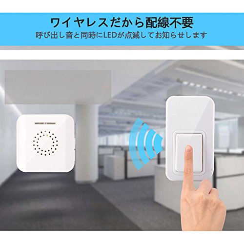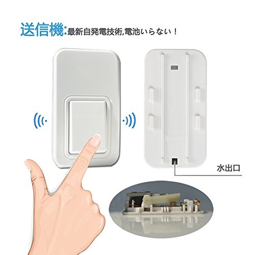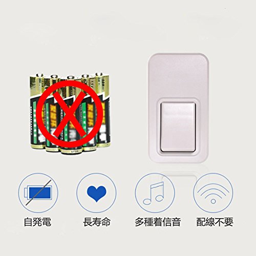 - 最新の自発電技術で電池不要を実現したワイヤレスチャイムです。イノベーション技術を採用して、バッテリを使用せずに、送信機ボタンを押すと、内部のエネルギー変換モジュールが機械エネルギーを自動的に電気エネルギーに変換します。