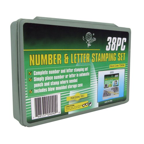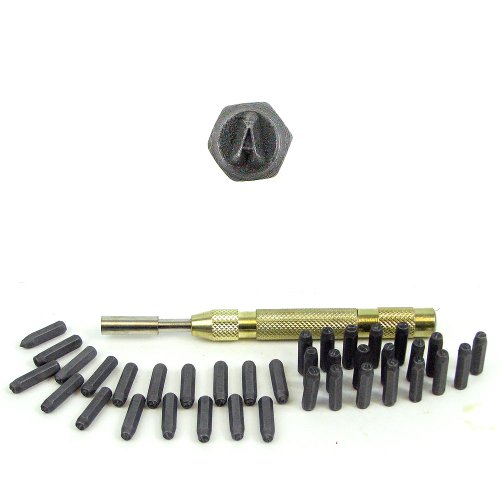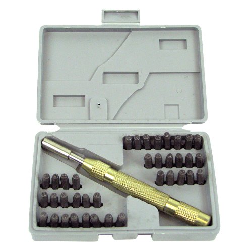 Heavy Duty brass punch and stamp holder comes with letters A-Z ampersand (&) plus numerals 0-8 (use 6 for 9). Each piece of this kit fits nicely in its custom storage/carry case. Features: Complete number and letter stamping set Simply place the number or letter in the automatic punch and stamp where needed Includes molded storage case Professional tools Heavy duty brass stamper - 6.75 inches long3/16 inch stock