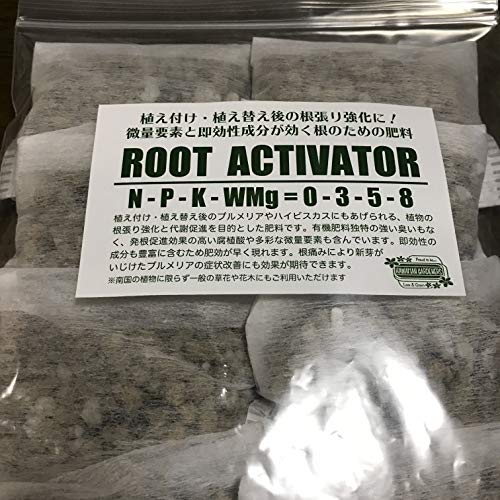 【ゆうパケットでのお届けのため2個以上の同梱不可(苗などゆうパックでのお届け商品との同梱は可能です)】 植え付け・植え替え時に与えられる根と植物体強化のための肥料☆ これまで長年ご好評いただいていた植え付け時にあげる根のための肥料「PLUMERIA ACTIVATOR」がリニューアル! プルメリア苗をお買い上げいただいたお客様からの多数のご要望により、これまで質問の多かった植え付け時や植え替え時にあげられる有機系肥料のブレンドを、肥料メーカーさんと共同で開発しました。 即効性成分が根の発育を促し、植え付け・植え替え後の活着を早めてくれる肥料です。南国の植物や一般の花木・草花全般に効果を発揮しますので、植物全般に広くご使用いただけます。水溶性マグネシウムや腐食酸を始め多彩な中微量要素も含まれる低臭タイプの有機肥料です。 ●本肥料の特徴 肥料メーカーさんと共同でブレンド方法を開発した当園オリジナルの有機肥料です。有機肥料特有の強い匂いがなく、室内でもご使用いただける低臭タイプの有機肥料です。プルメリアのみならず花をさかせる南国の植物全般にご利用いただけます。根の発育を促すカリ成分は水溶性で即効性がありますので、最近ちょっと元気がないなと感じるプルメリアにあげると根から元気にしてくれます。 吸収されやすいリン酸を豊富に含むとともに、即効性かつ持続性のある特殊な水溶性マグネシウムを含むため、葉の葉緑素の充実をはかるとともに締まった弾力のある葉を作り、光合成の活性化を実現します。植え付け後や植え替え後の生育をブーストしたいというシチュエーションや、冬越し前の秋の後半に根をしっかりと作っておきたいなというシチュエーション、さらには春先に目覚め始めて葉が展開し始めたプルメリアにも使っていただけます。 ●主要成分:N-P-K-WMg = 0 - 3 - 5 - 8 ●内容量:10パック 約350g ●注意事項:鉢にお茶パックのまま置肥してください。施水時に一緒に上から水をかけてください。肥料に対する知識に自信のない方はこの肥料のみ単独で使用ください(ラピッドスタート、フローリシャスプラス、フルボ酸は併用可能)。 使用個数は6号鉢以下は1個、7号鉢&8号は2個、9号は3個、10号鉢以上は4個もしくはそれ以上でも大丈夫です。11号は5〜6個が目安ですが、まずは必要最低限の個数で試してください。 肥料の目方は重点時重量であり、空気中の湿度により多少前後します。