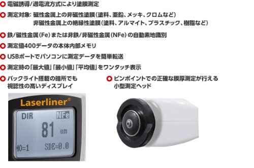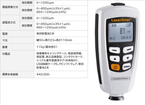 ■【塗装をスピーディーにピンポイントチェック】【電磁誘導過電流方式】アルミ・ステンレス製品機械部品塗装ライニングチェック■塗装をスピーディにピンポイントチェック!鉄、非鉄の測定素地を自動識別。寸法:幅50×奥行23×高さ110mm電磁誘導方式:測定範囲0~1250μm測定精度0~850μm(±3%+1μm)/850~1250μm(±5%)過電流方式:測定範囲0~1250μm測定精度0~850μm(±3%+1μm)/850~1250μm(±5%)■電源:単四乾電池2本■寸法:幅50×奥行23×高さ110mm■重量:115g(電池含む)■付属品:保管兼用キャリングケース、取扱説明書/保証書、純正品検査証/コンタクトカード、シリアル番号登録済タグ(本体貼付)/USB接続ケーブル、PCソフトウェア/単四乾電池2本