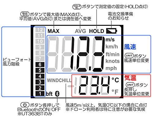 - 機能:バックライトON/OFF、オートパワーOFF5分※オートパワーOFF機能の無効は可。磁気誘導式風速センサ・NTC負温度係数センサ搭載。非防水。