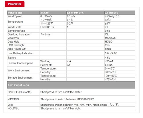 - 機能:バックライトON/OFF、オートパワーOFF5分※オートパワーOFF機能の無効は可。磁気誘導式風速センサ・NTC負温度係数センサ搭載。非防水。